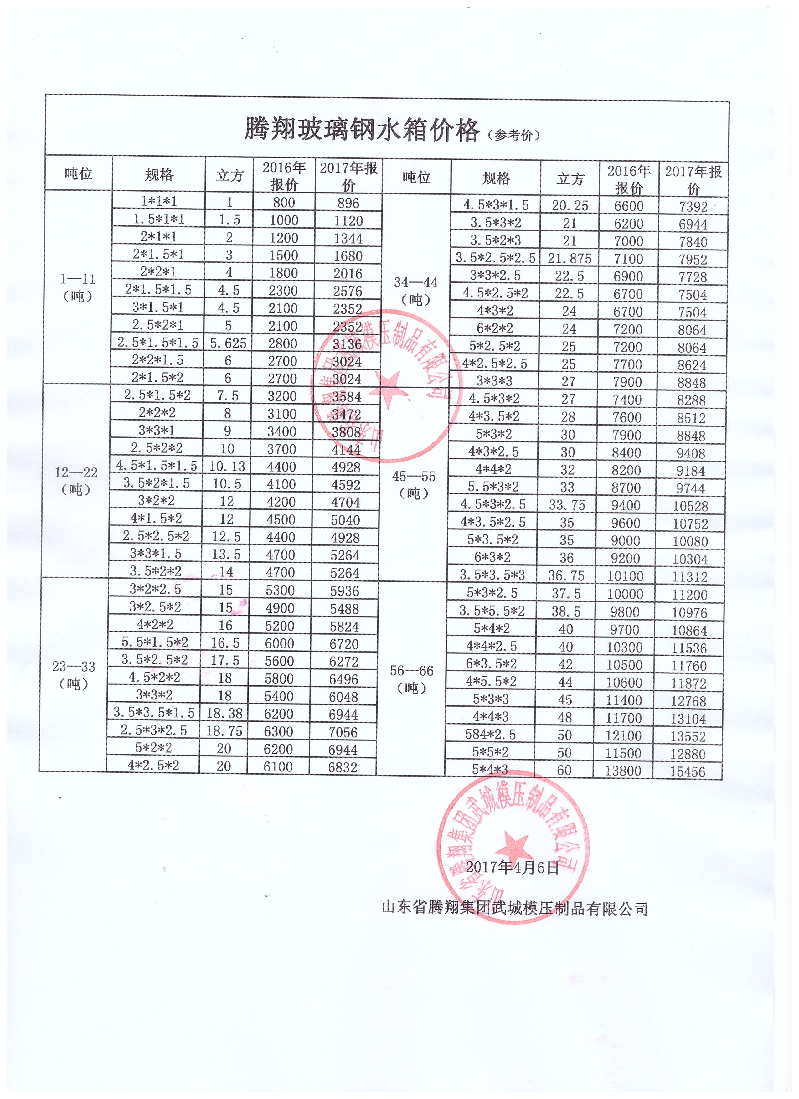 2017年玻璃鋼水箱價(jià)格表
